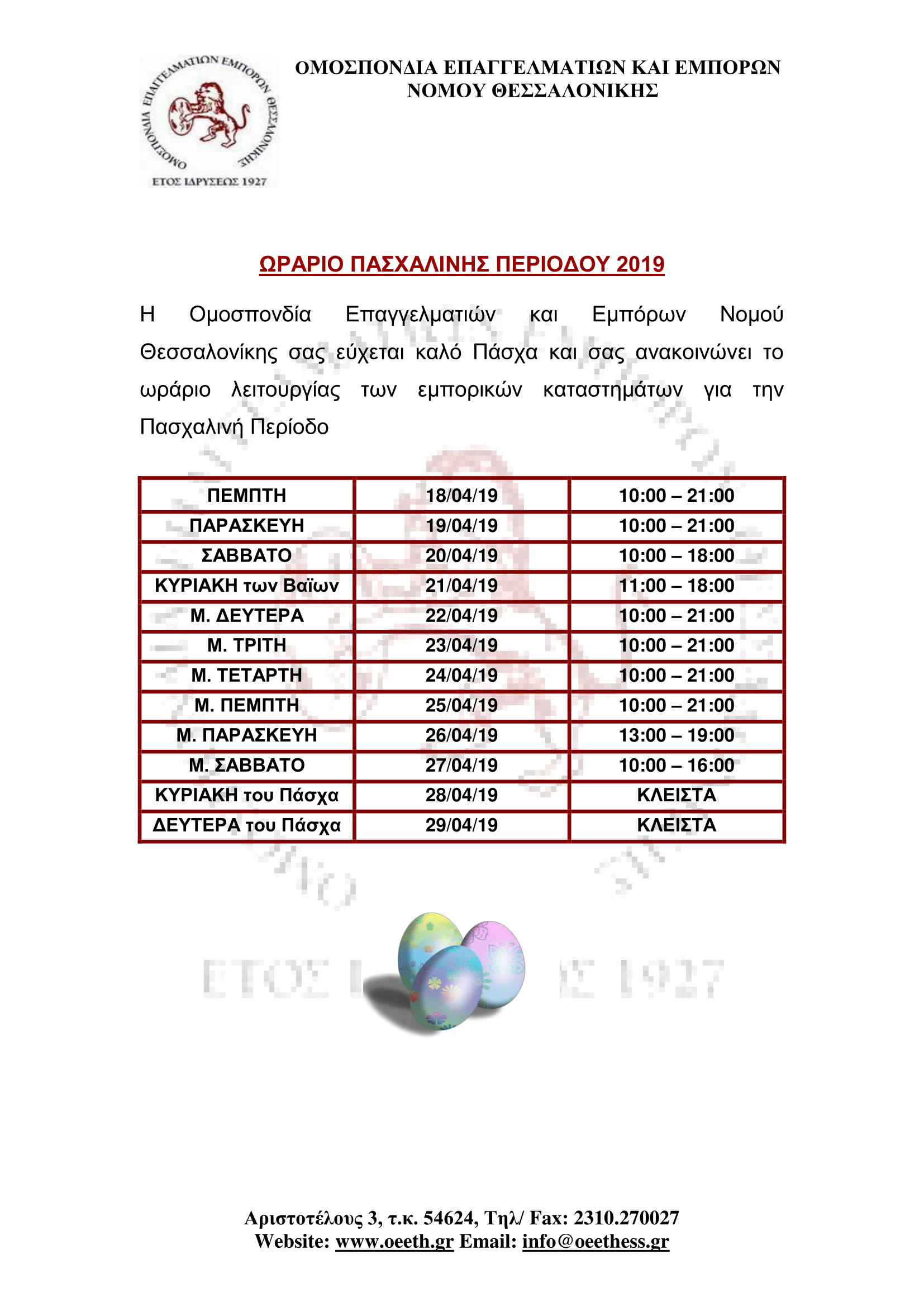 ΩΡΑΡΙΟ ΛΕΙΤΟΥΡΓΙΑΣ ΚΑΤΑΣΤΗΜΑΤΩΝ ΓΙΑ ΤΗΝ ΠΑΣΧΑΛΙΝΗ ΠΕΡΙΟΔΟ 2019