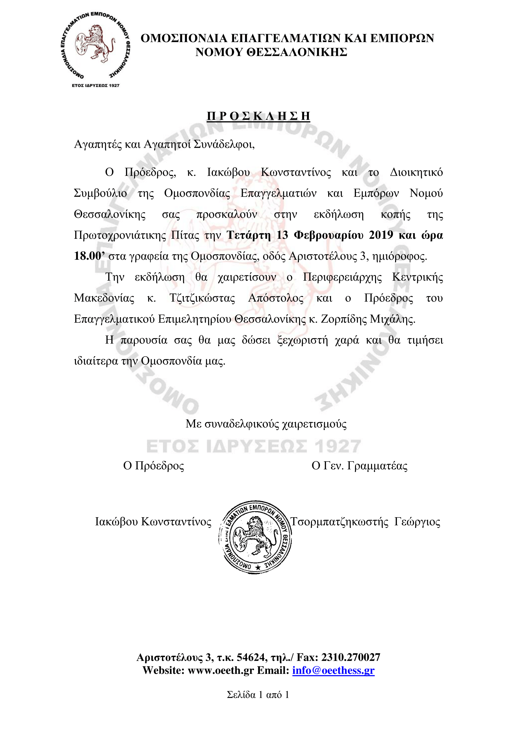 ΠΡΟΣΚΛΗΣΗ ΣΤΗ ΚΟΠΗ ΠΡΩΤΟΧΡΟΝΙΑΤΙΚΗΣ ΠΙΤΑΣ