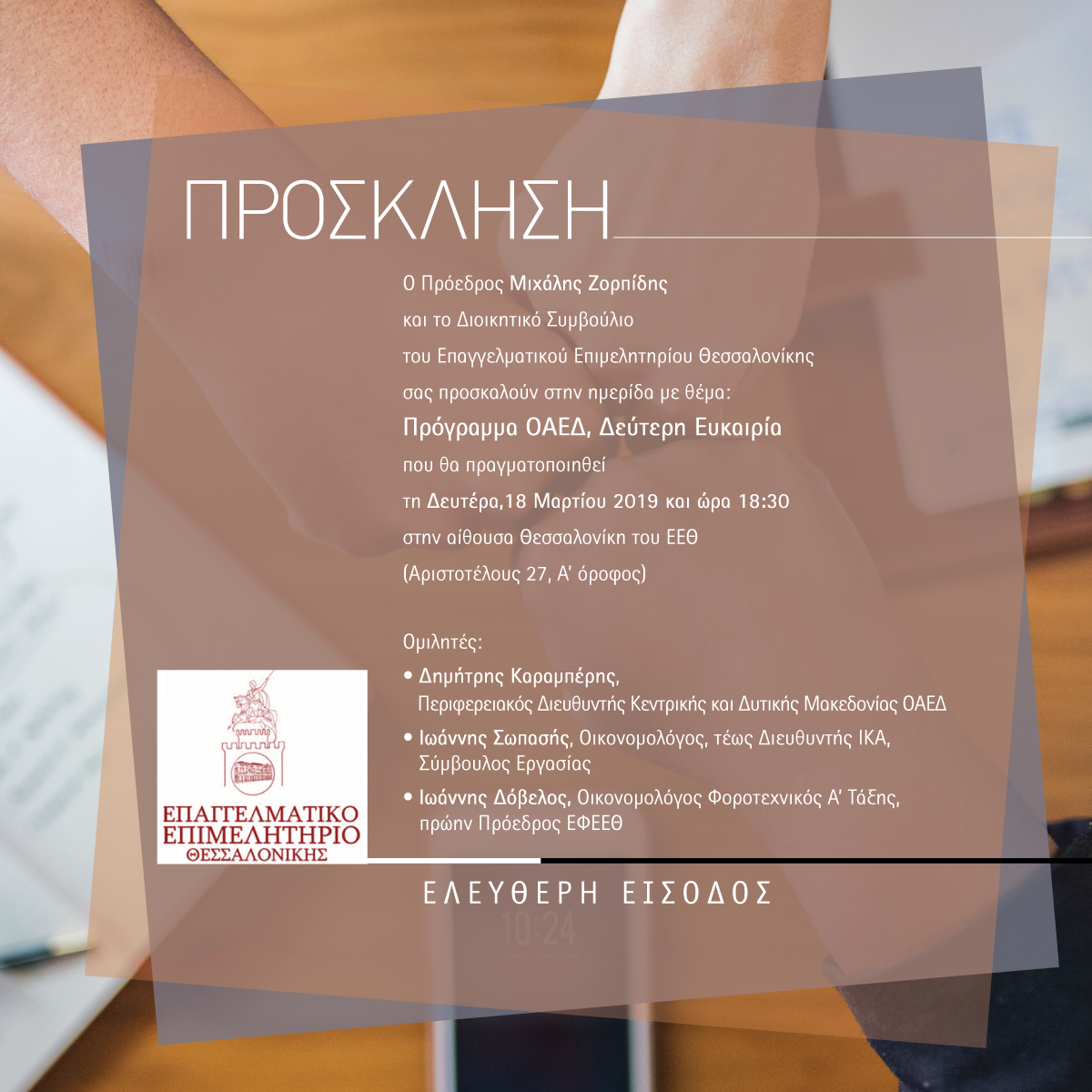 Ο Πρόεδρος κ. Ζορπίδης Μιχάλης και το Διοικητικό Συμβούλιο του Επαγγελματικού Επιμελητηρίου Θεσσαλονίκης σας προσκαλούν την Δευτέρα 18 Μαρτίου 2019 και ώρα 18:30 στην Αίθουσα Θεσσαλονίκη του Ε.Ε.Θ. (Αριστοτέλους 27, 1ος Όροφος) όπου θα πραγματοποιηθεί ημερίδα με θέμα » Πρόγραμμα ΟΑΕΔ, Δεύτερη Ευκαιρία».