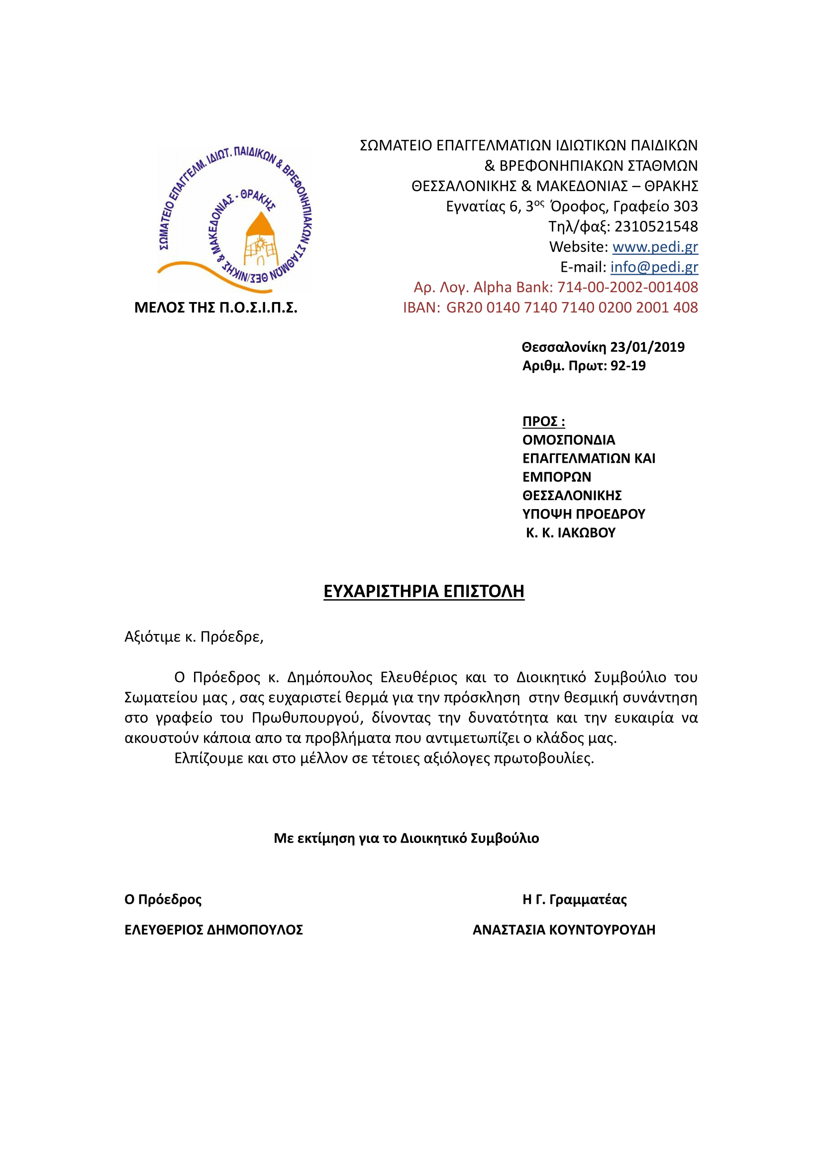Ευχαριστήρια επιστολή προς τον Πρόεδρο της Ο.Ε.Ε.Θ κ. Ιακώβου έστειλε το Σωματείο Επαγγελματιών Ιδιωτικών Παιδικών & Βρεφονηπιακών Σταθμών Θεσσαλονίκης & Μακεδονίας – Θράκης. Ακολουθεί παρακάτω η επιστολή. ΕΥΧΑΡΙΣΤΗΡΙΑ ΕΠΙΣΤΟΛΗ