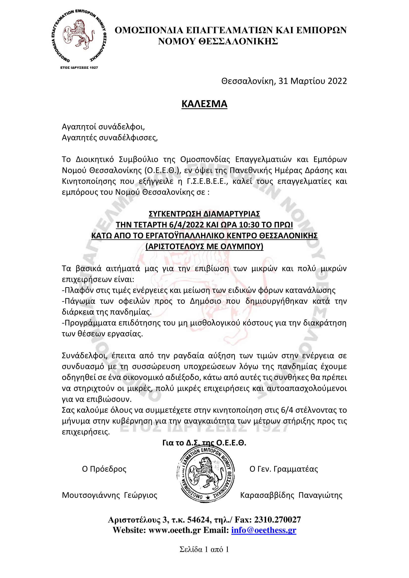 ΚΑΛΕΣΜΑ Ο.Ε.Ε.Θ. ΣΕ ΣΥΓΚΕΝΤΡΩΣΗ ΔΙΑΜΑΡΤΥΡΙΑΣ ΤΗΝ ΤΕΤΑΡΤΗ 6 ΑΠΡΙΛΙΟΥ 2022
