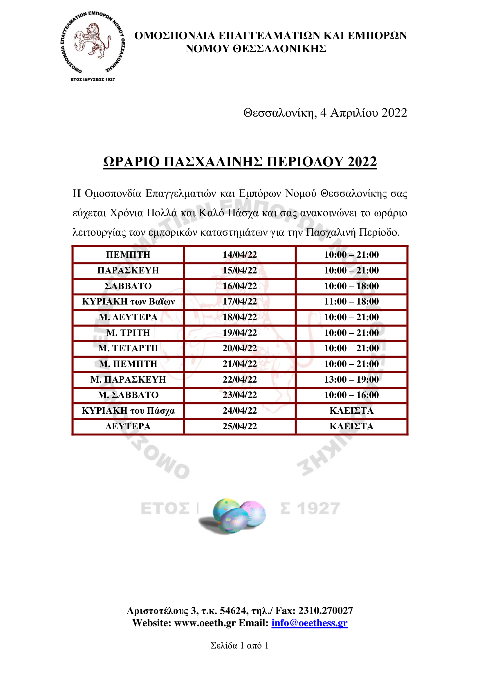 ΩΡΑΡΙΟ ΚΑΤΑΣΤΗΜΑΤΩΝ ΠΑΣΧΑΛΙΝΗΣ ΠΕΡΙΟΔΟΥ 2022