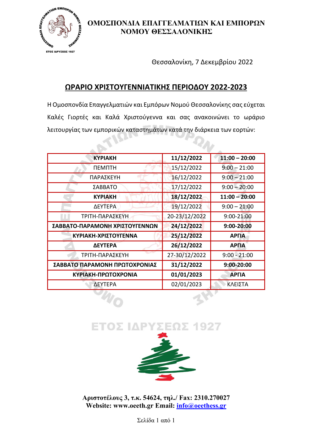 ΩΡΑΡΙΟ ΧΡΙΣΤΟΥΓΕΝΝΙΑΤΙΚΗΣ ΠΕΡΙΟΔΟΥ 2022-2023