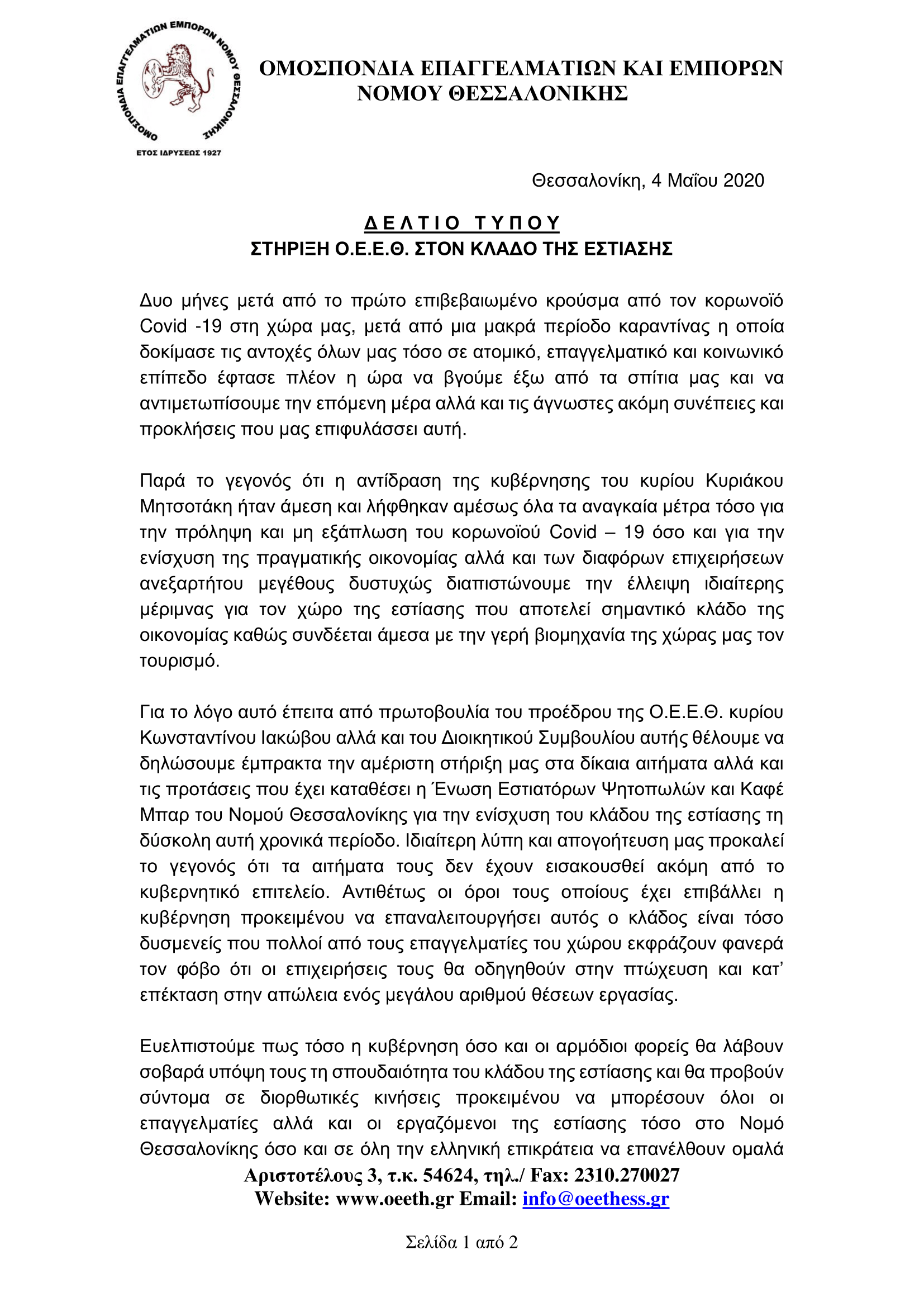 ΔΕΛΤΙΟ ΤΥΠΟΥ – ΣΤΗΡΙΞΗ ΤΗΣ Ο.Ε.Ε.Θ ΣΤΟΝ ΚΛΑΔΟ ΤΗΣ ΕΣΤΙΑΣΗΣ
