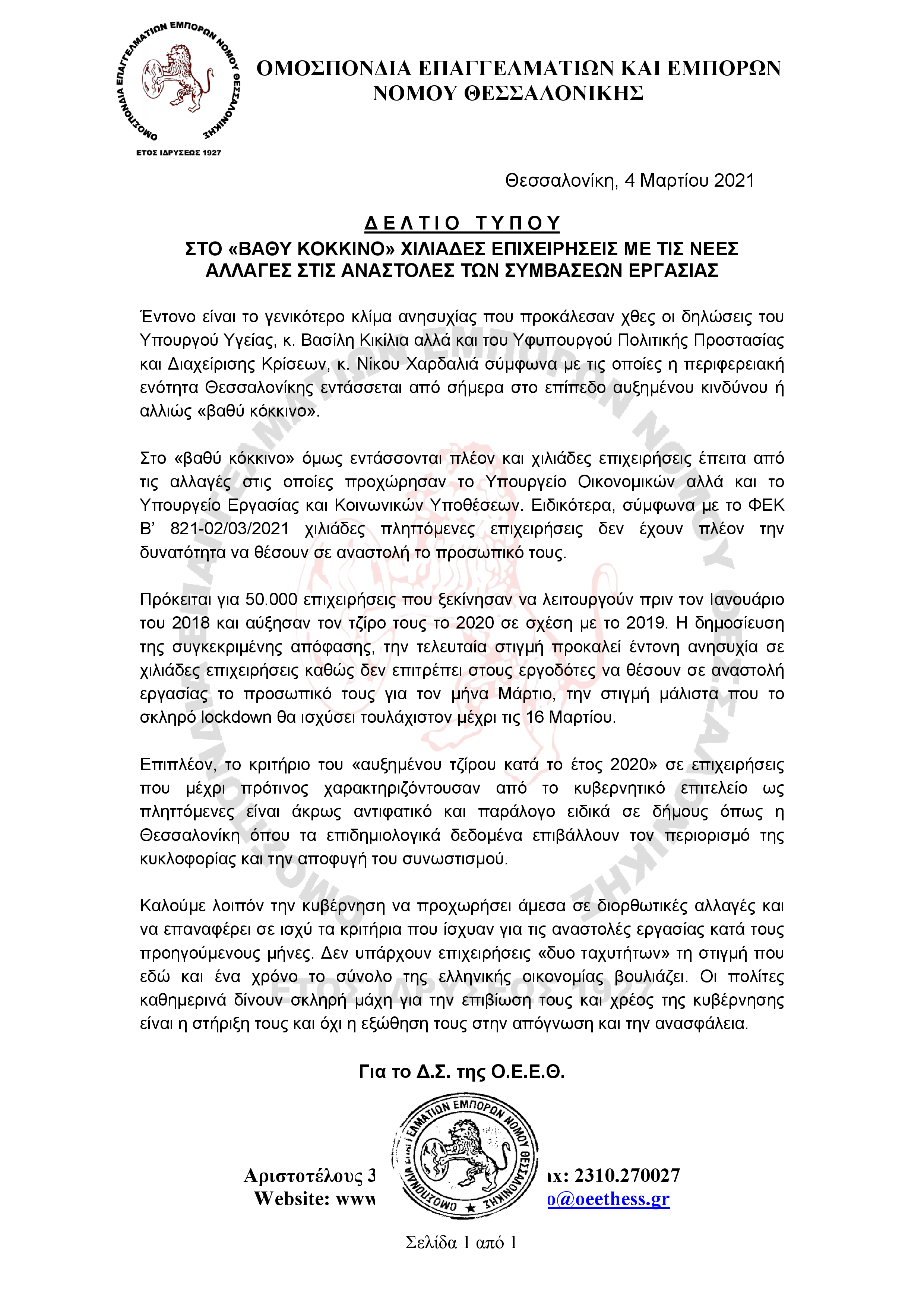 ΔΕΛΤΙΟ ΤΥΠΟΥ – ΣΤΟ ΒΑΘΥ ΚΟΚΚΙΝΟ ΧΙΛΙΑΔΕΣ ΕΠΙΧΕΙΡΗΣΕΙΣ ΜΕ ΤΙΣ ΝΕΕΣ ΑΛΛΑΓΕΣ ΣΤΙΣ ΑΝΑΣΤΟΛΕΣ ΤΩΝ ΣΥΜΒΑΣΕΩΝ ΕΡΓΑΣΙΑΣ