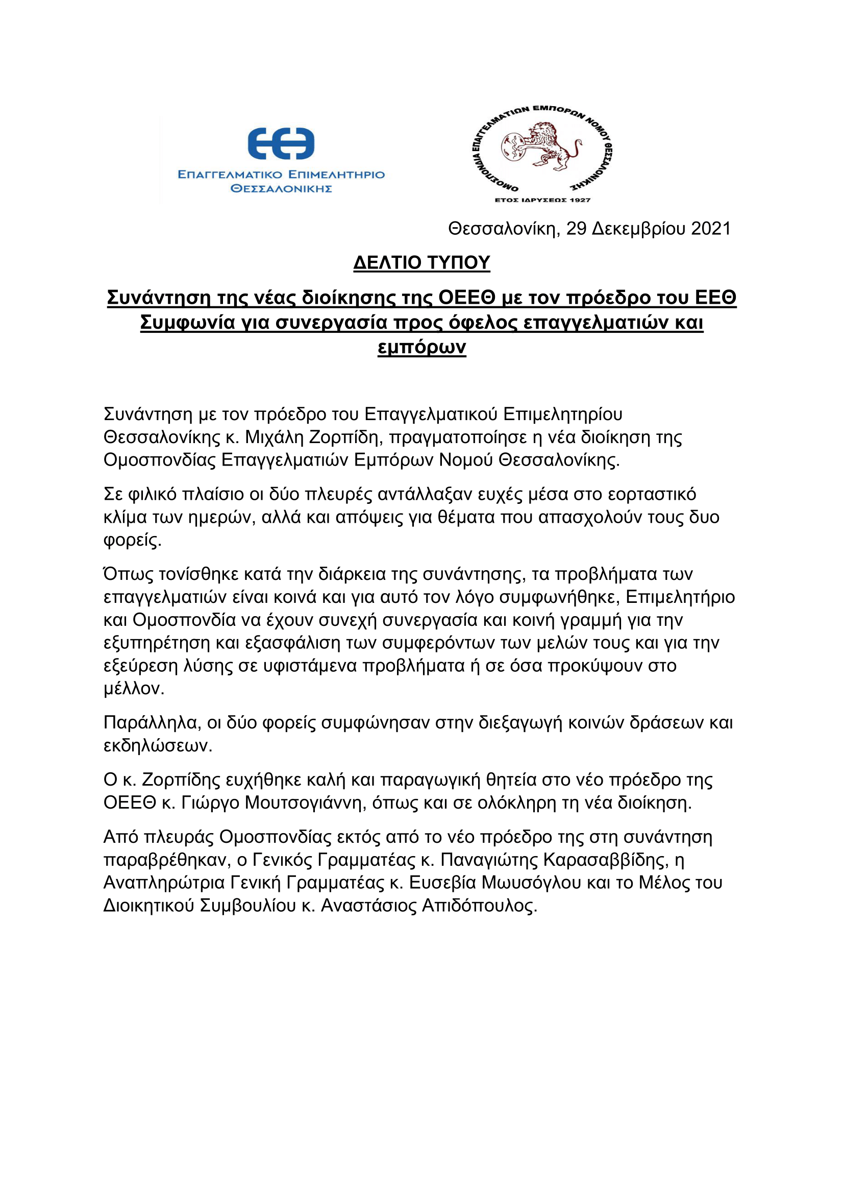 ΔΕΛΤΙΟ ΤΥΠΟΥ – ΣΥΝΑΝΤΗΣΗ ΤΗΣ ΝΕΑΣ ΔΙΟΙΚΗΣΗΣ ΤΗΣ Ο.Ε.Ε.Θ. ΜΕ ΤΟΝ ΠΡΟΕΔΡΟ ΤΟΥ Ε.Ε.Θ. – ΣΥΜΦΩΝΙΑ ΓΙΑ ΣΥΝΕΡΓΑΣΙΑ ΠΡΟΣ ΟΦΕΛΟΣ ΕΠΑΓΓΕΛΜΑΤΙΩΝ ΚΑΙ ΕΜΠΟΡΩΝ