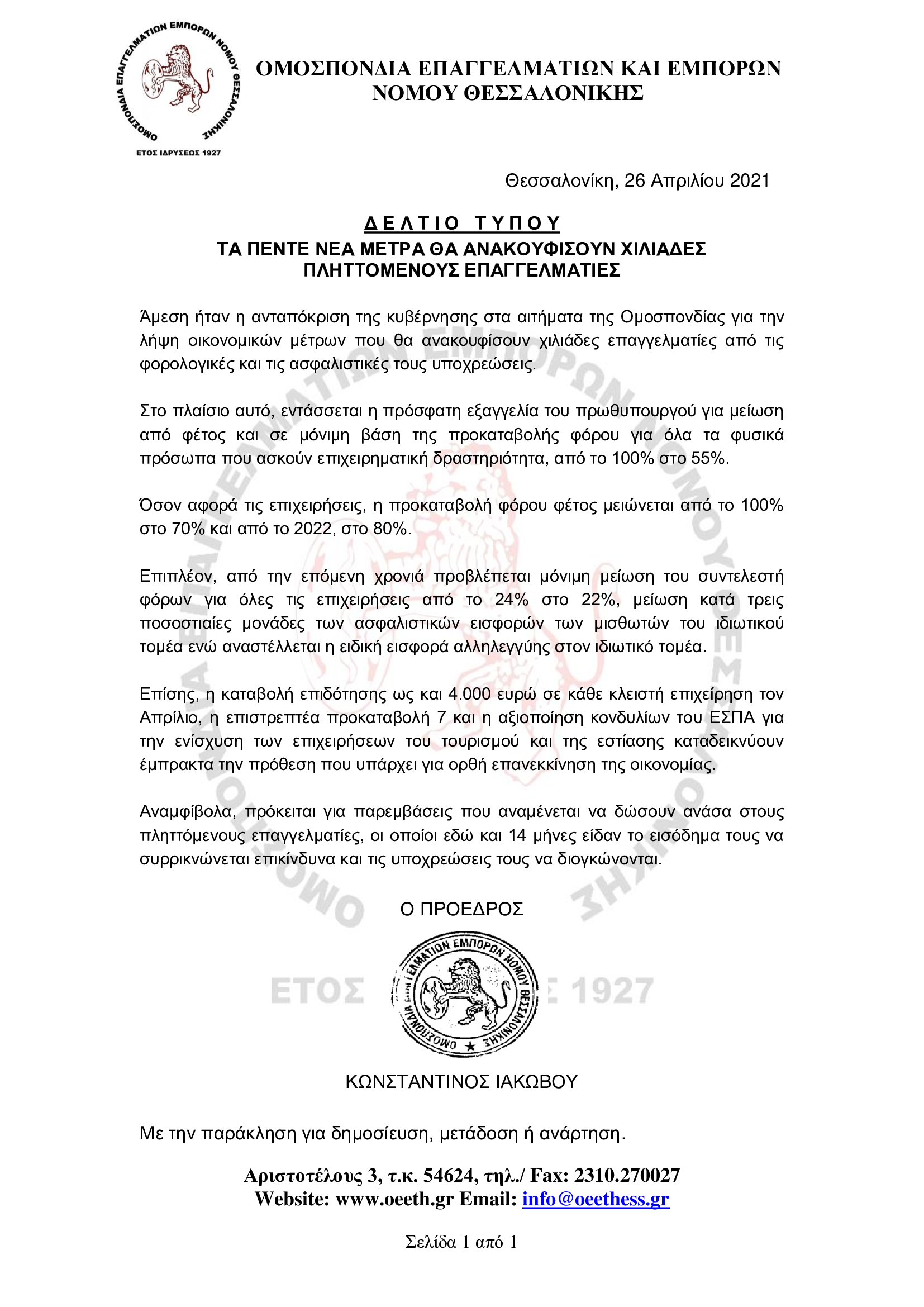 ΔΕΛΤΙΟ ΤΥΠΟΥ – ΤΑ ΠΕΝΤΕ ΝΕΑ ΜΕΤΡΑ ΘΑ ΑΝΑΚΟΥΦΙΣΟΥΝ ΧΙΛΙΑΔΕΣ ΠΛΗΤΤΟΜΕΝΟΥΣ ΕΠΑΓΓΕΛΜΑΤΙΕΣ