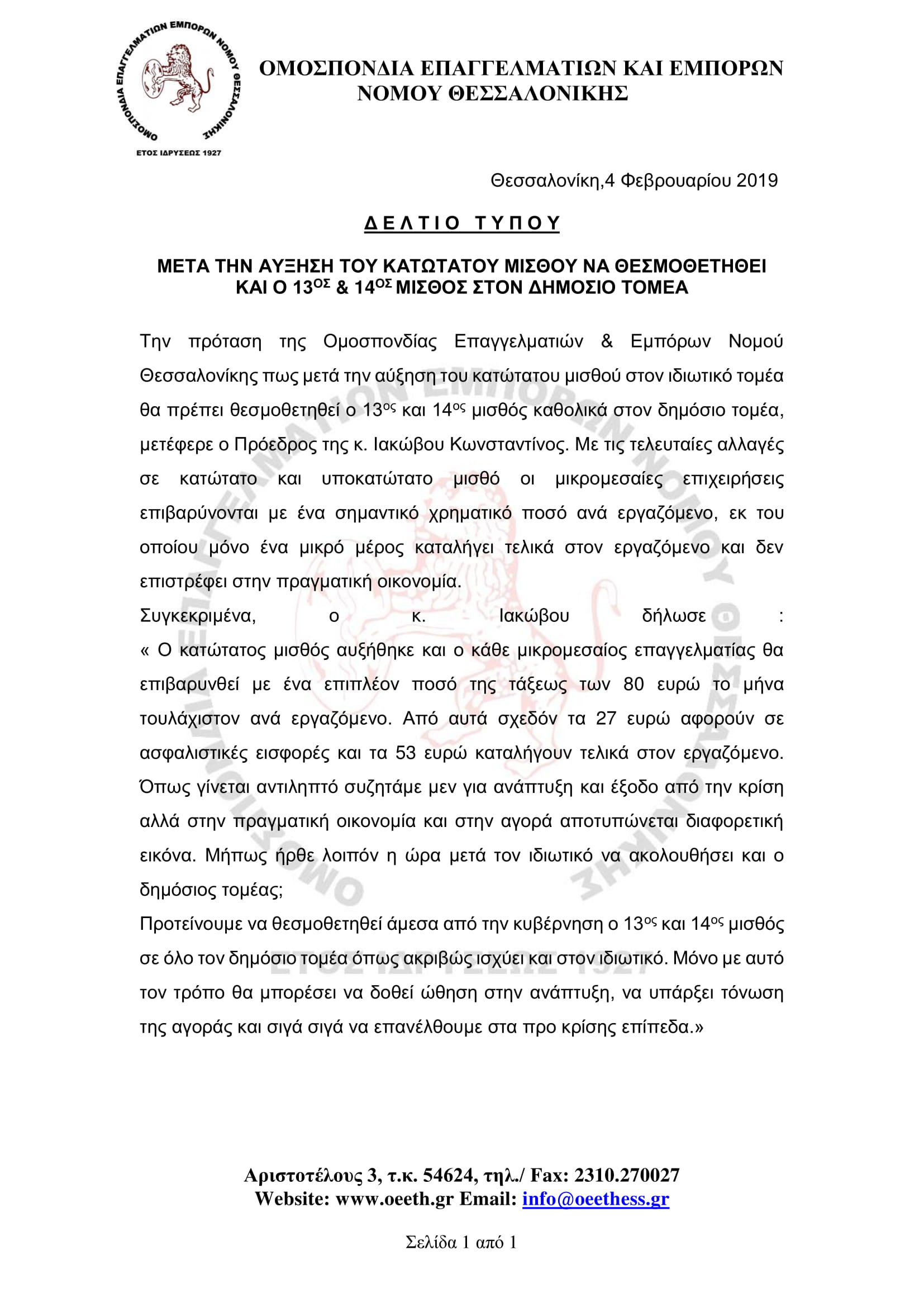 ΔΕΛΤΙΟ ΤΥΠΟΥ ΟΕΕΘ ΓΙΑ ΑΥΞΗΣΗ ΚΑΤΩΤΑΤΟΥ ΜΙΣΘΟΥ ΚΑΙ ΘΕΣΜΟΘΕΤΗΣΗ 13ΟΥ ΚΑΙ 14ΟΥ ΜΙΣΘΟΥ ΣΤΟ ΔΗΜΟΣΙΟ ΤΟΜΕΑ