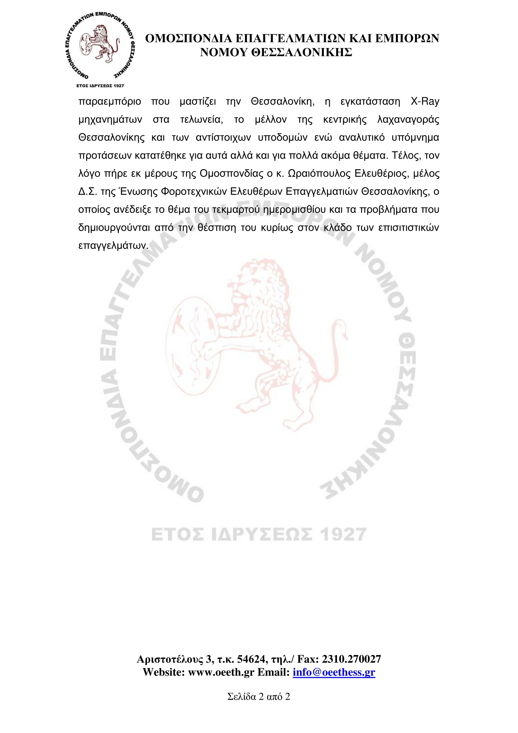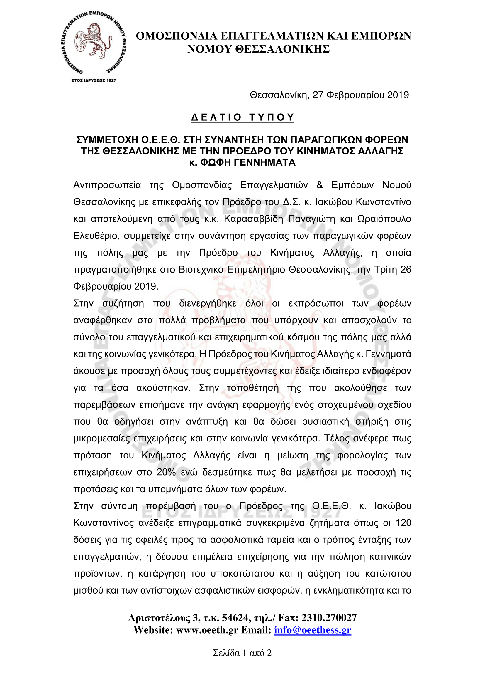 ΔΕΛΤΙΟ ΤΥΠΟΥ ΟΕΕΘ – ΣΥΝΑΝΤΗΣΗ ΜΕ ΤΗΝ ΠΡΟΕΔΡΟ ΤΟΥ ΚΙΝ.ΑΛ κ. ΦΩΦΗ ΓΕΝΝΗΜΑΤΑ