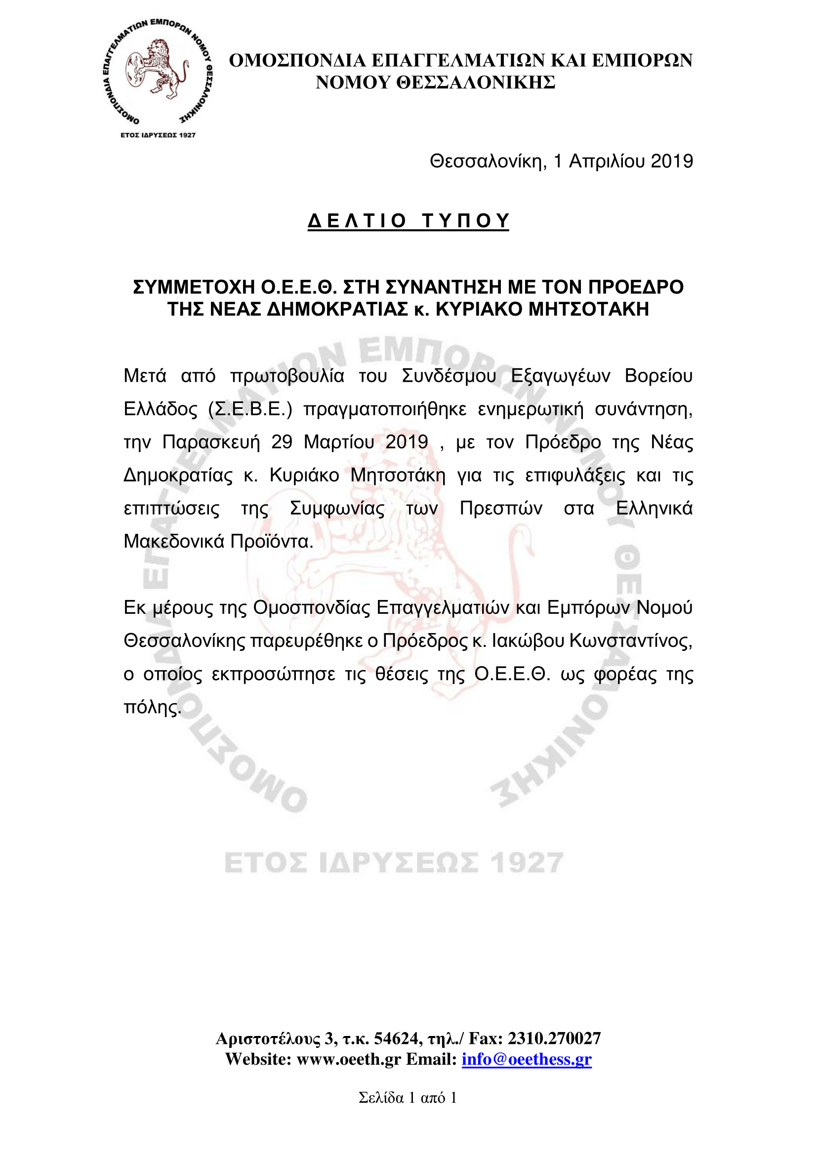 ΔΕΛΤΙΟ ΤΥΠΟΥ ΟΕΕΘ – ΣΥΝΑΝΤΗΣΗ ΜΕ ΤΟΝ ΠΡΟΕΔΡΟ ΤΗΣ ΝΕΑΣ ΔΗΜΟΚΡΑΤΙΑΣ κ. ΚΥΡΙΑΚΟ ΜΗΤΣΟΤΑΚΗ